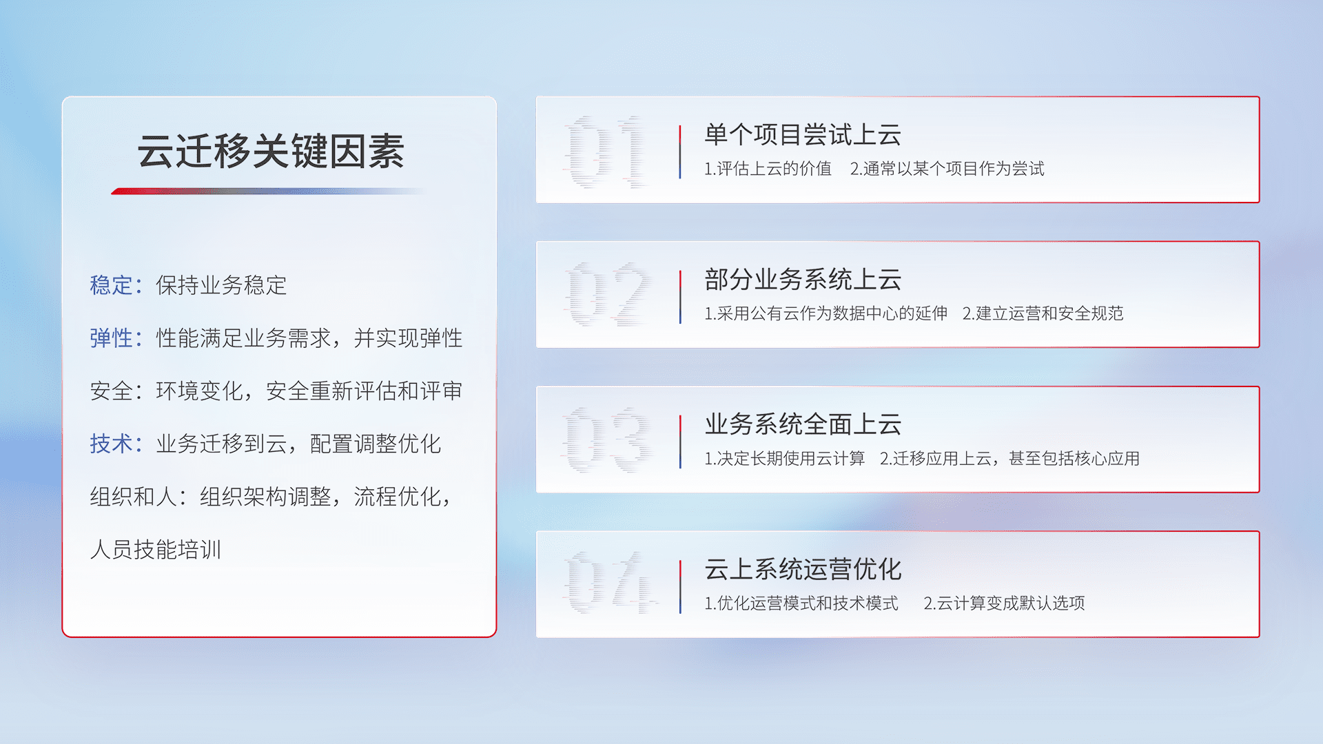 结合实际业务,,,,从规划设计、、、、云平台选型、、云原生改造、、数据迁移、、、、集成交付,,,迁移全过程为客户识别最佳上云路径,,,,做好风险识别管理,,,设计网络架构、、、、身份权限、、安全审计合规、、、、操作审计、、、、日志审计、、、、监控告警策略、、、、多站点容灾设计等,,对云上基础设施进行整体规划,,,,提升IT治理水平,,以满足弹性、、、、高可用、、、高性能的需求。。。